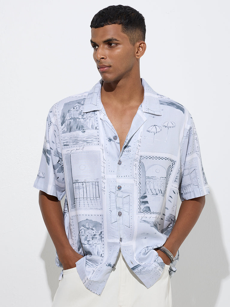 This light grey shirt from Nuon showcases scenic-inspired patterns for a laid-back, artistic flair. Crafted from an ultra-lightweight fabric in a relaxed silhouette, it features a breezy camp collar, a button placket, and half sleeves.
