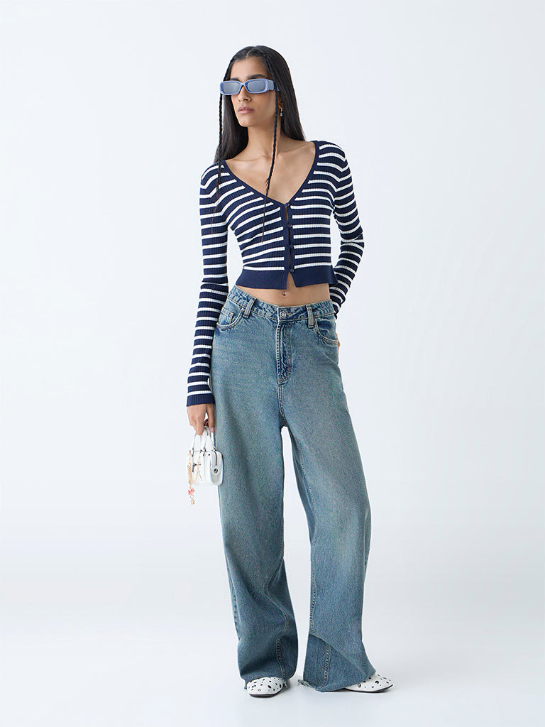 This navy top from Nuon showcases bold stripes and a ribbed-textured finish. Designed with a deep V-neck that extends into a buttoned placket, it’s framed with full sleeves for an elevated silhouette.