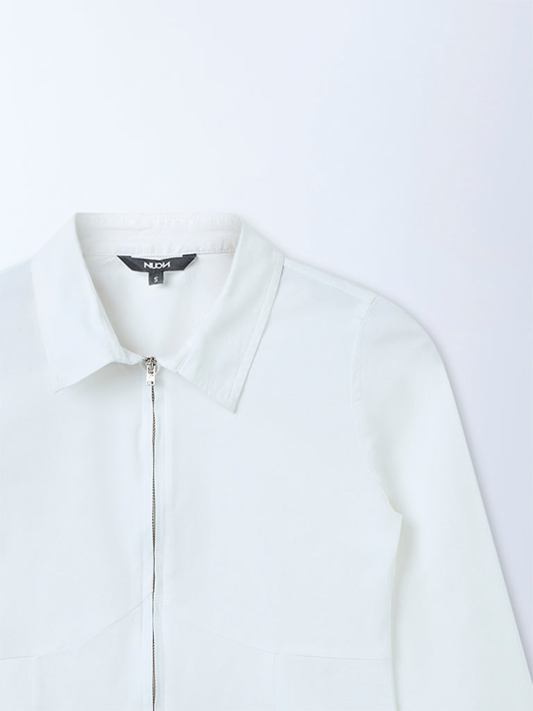 Nuon presents this off-white top designed with a clean, modern edge. Featuring a smart collar, full sleeves, and a zip-front closure, it is detailed with underbust stitched seams that define the silhouette. Easy to style for both casual and semi-formal looks, it brings a sharp finish to everyday dressing.
