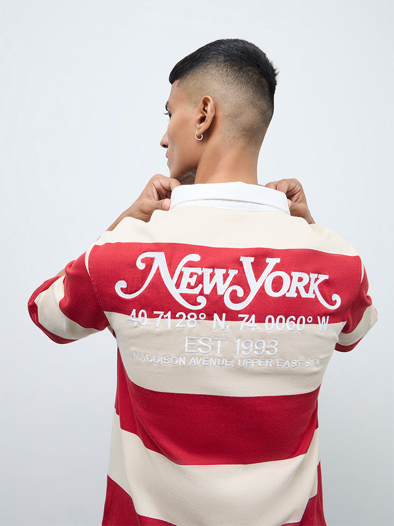 Presenting an easy pick for off-duty days, this red polo t-shirt from Nuon boats bold stripes and text embroidery on the front and back. It is sculpted from a cotton-rich fabric in a relaxed silhouette, delivering sumptuous comfort for cozy days. The regular collar, brief button placket and short sleeves adds to the effortless laid-back appeal.