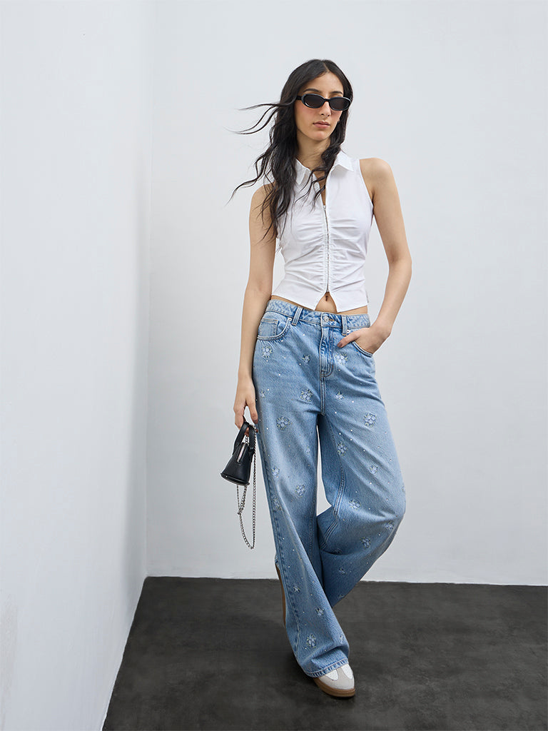 Styled for contemporary wardrobes, this white blouse from Nuon offers a sleek look. It features a classic collar and a zipper front, accented with soft ruching along the placket for subtle definition. Designed in a sleeveless cut, it is made from a soft, lightweight fabric that feels easy against the skin. A sharp piece that works well with tailored bottoms or relaxed separates.