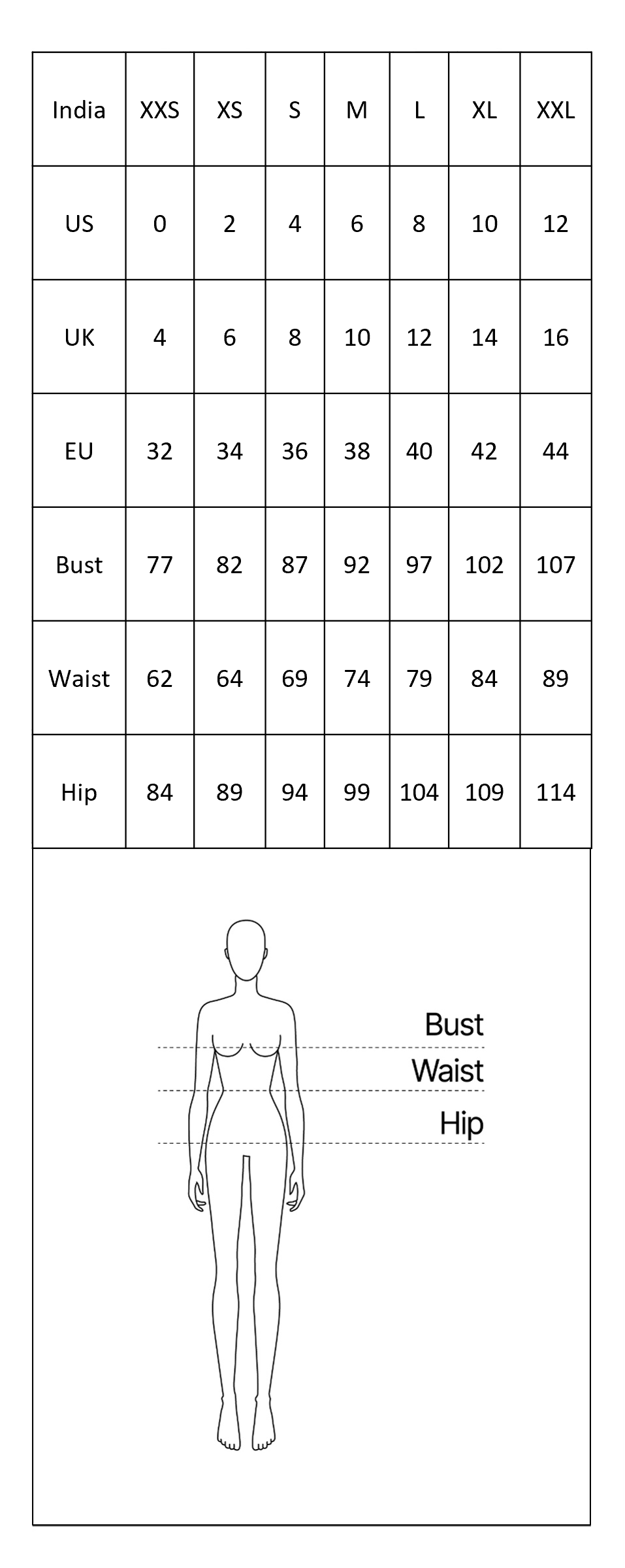 | Size (A) | To Fit Bust (B) | To Fit Waist (C) | To Fit Hip (D) |