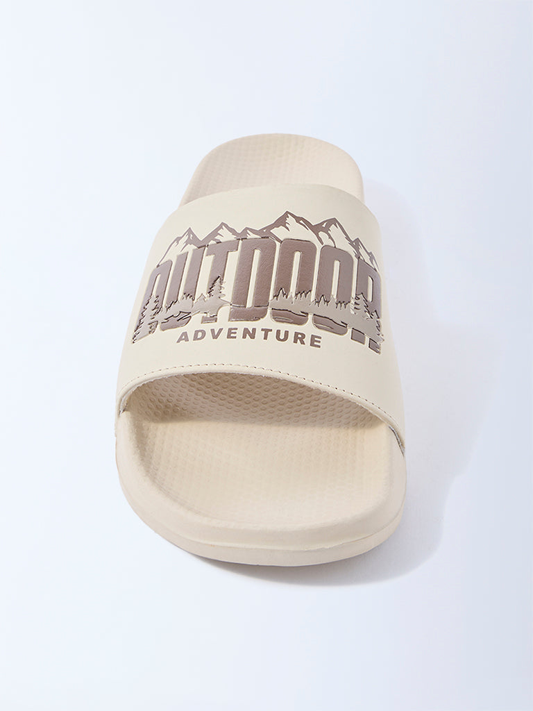 Made for easy days, these beige slides from Soleplay channel an adventurous spirit. Featuring a bold text design across the wide strap, they add character to casual looks. The soft footbed provides comfort through every step, while the textured outsole ensures a steady grip.