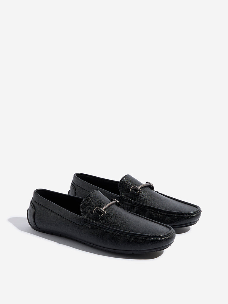 These black loafers from Soleplay are crafted from premium faux leather, offering a sleek silhouette with a refined metal accent across the vamp. The soft construction ensures a comfortable fit, while the flexible rubber sole enhances ease of movement.