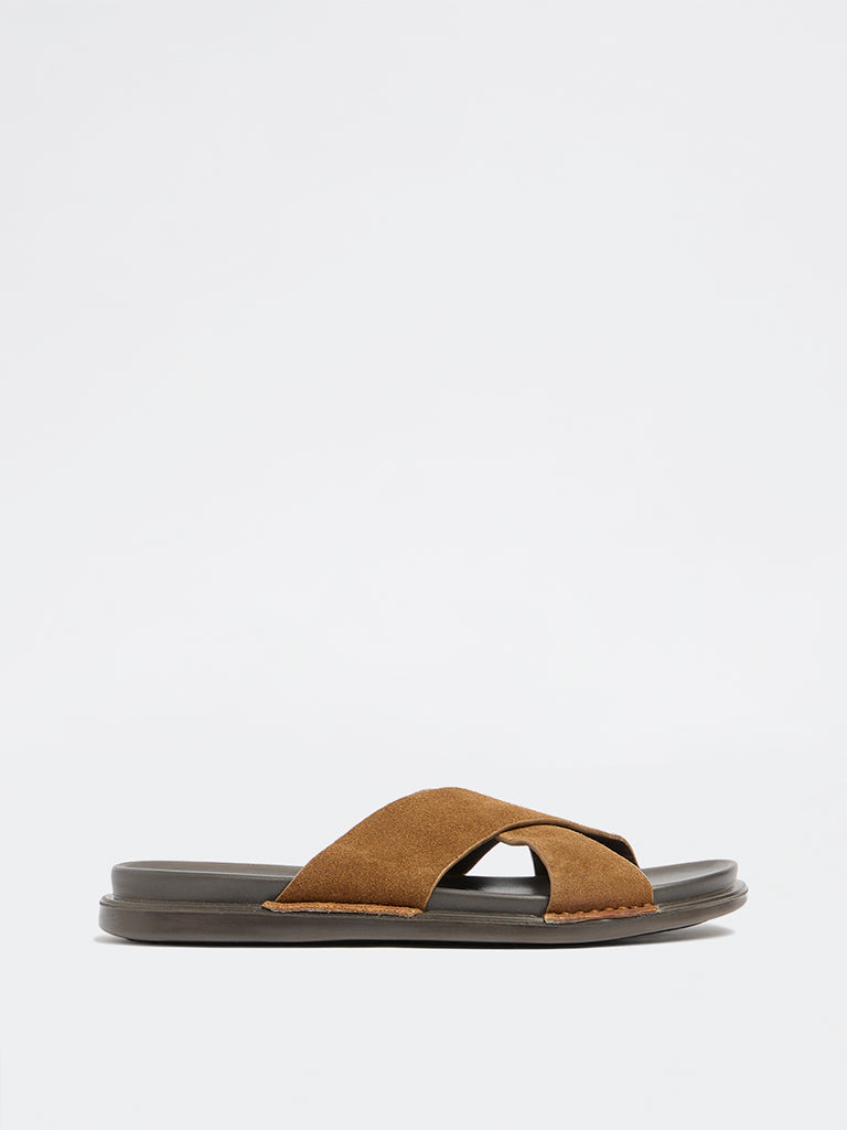 Add a contemporary touch to casual dressing with these tan suede leather sandals from Soleplay. Featuring broad criss-cross straps crafted in soft suede, they deliver a refined yet relaxed appeal. The contoured, cushioned footbed offers an all day comfort, while the textured outsole provides reliable grip, making them a stylish choice for everyday outings and laid-back occasions.
