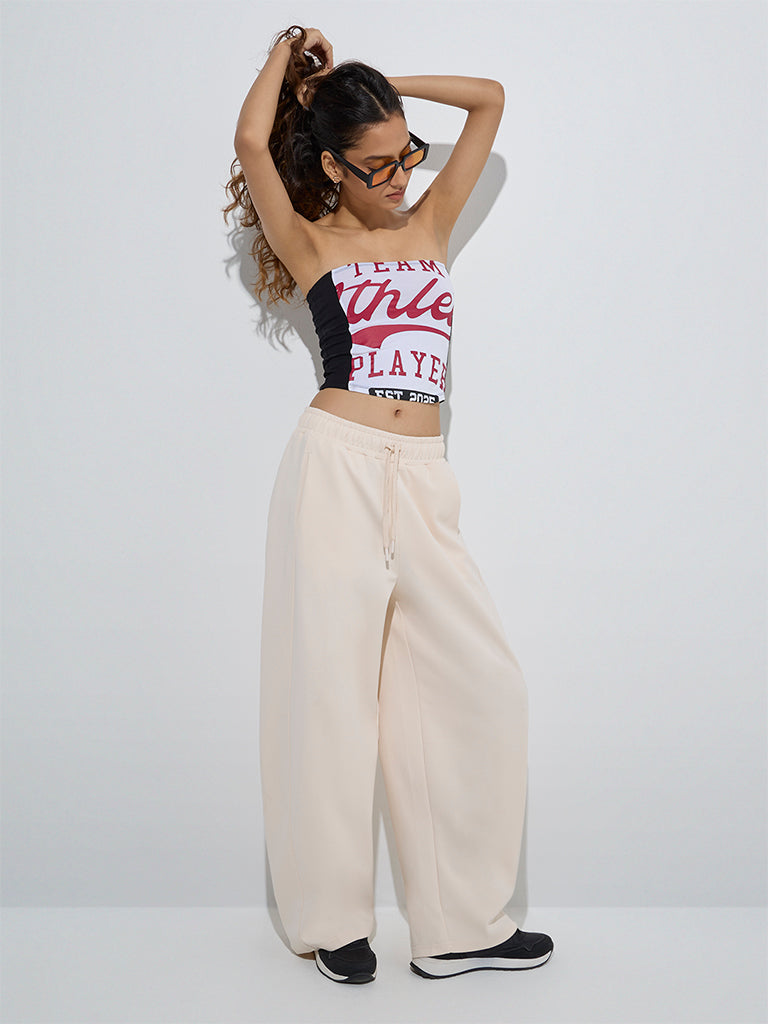 These beige high-rise track pants from Studiofit offer the perfect blend of comfort and versatility. Made from pure cotton, they feature a smooth elastic waistband with adjustable drawstrings and practical side pocket, ideal for effortless everyday wear.