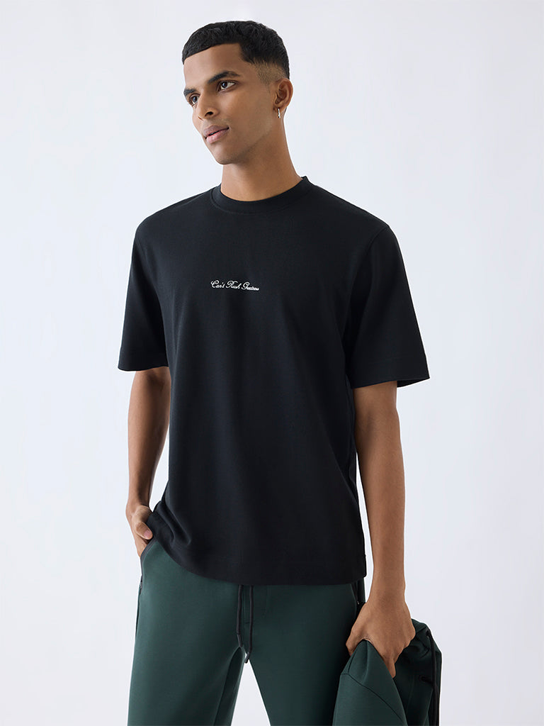 This black t-shirt from Studiofit delivers instant impact with its dainty text print across the front. Shaped in a relaxed fit from breathable fabric, this everyday staple pairs easy comfort with graphic edge.
