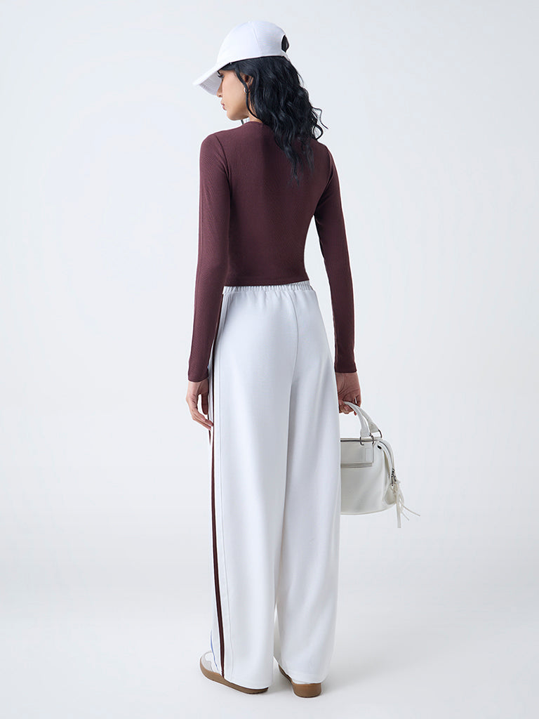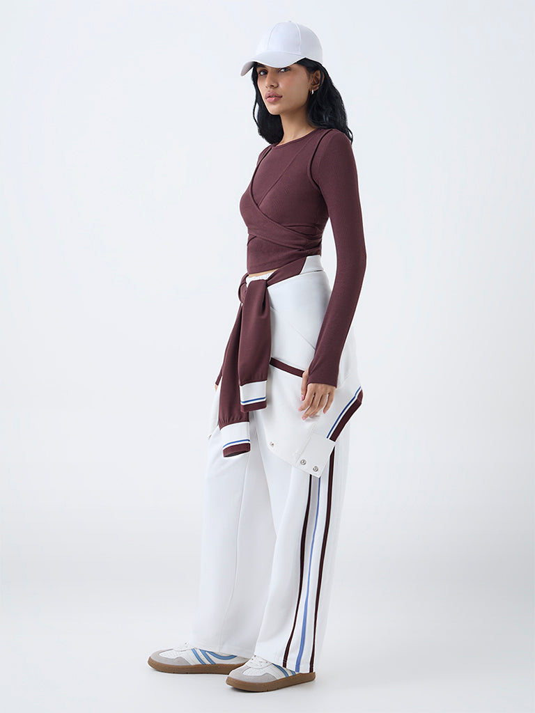 Elevate your sporty staples with this brown t-shirt by Studiofit, woven in a tactile ribbed texture for ease and flexibility. The intertwined front design defines the shape, complemented by a round neck and long sleeves.