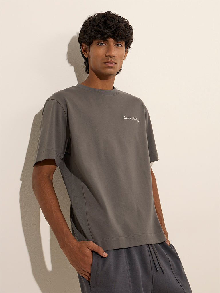 Studiofit launches this grey t-shirt designed with text embroidery. Crafted with soft and breathable fabric, it boasts a relaxed-fit frame. The garment carries a round neck and half sleeves.