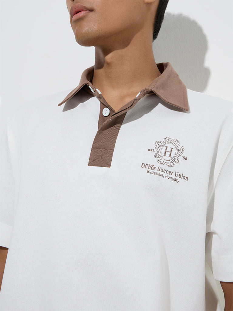Studiofit gives a sporty edge to everyday wear with this off-white polo t-shirt. Made from a soft cotton-blend, it features text embroidery for a subtle statement, a brown spread collar with a two-button placket, and raglan sleeves for a relaxed, athletic vibe.