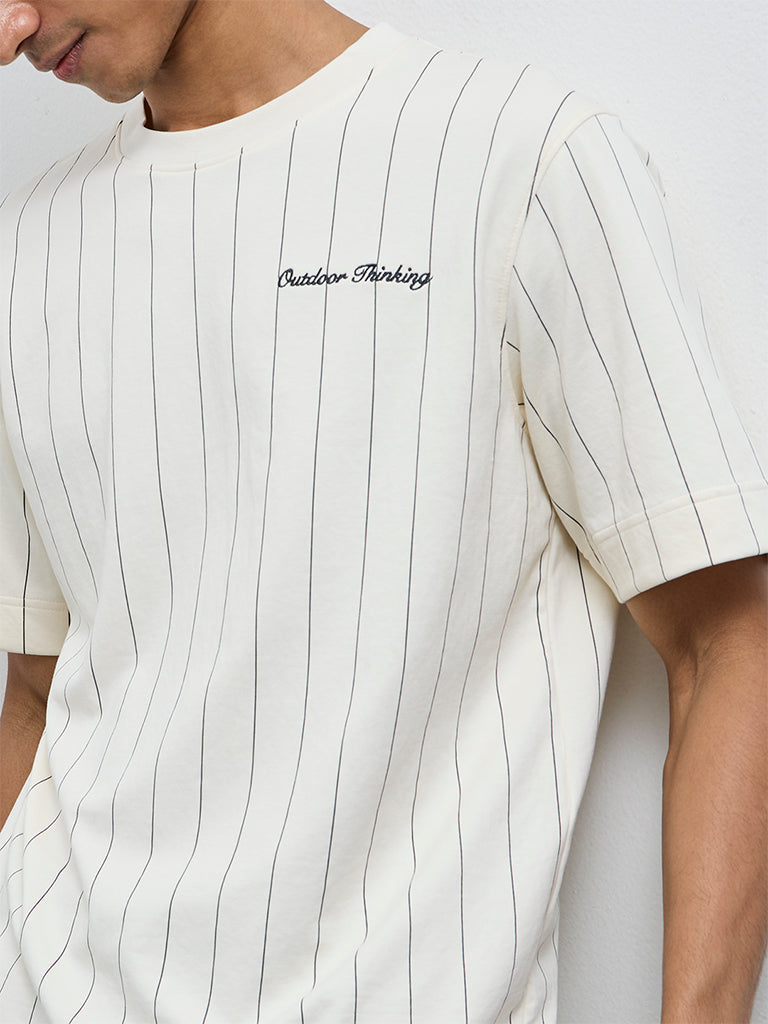 This off-white striped t-shirt from Studiofit is built for everyday movement and downtime. Shaped in a relaxed profile, it features a classic crew neckline and short sleeves for a clean, sporty look. Crafted from a soft, breathable fabric, it keeps you comfortable through workouts, travel, and off-duty wear.