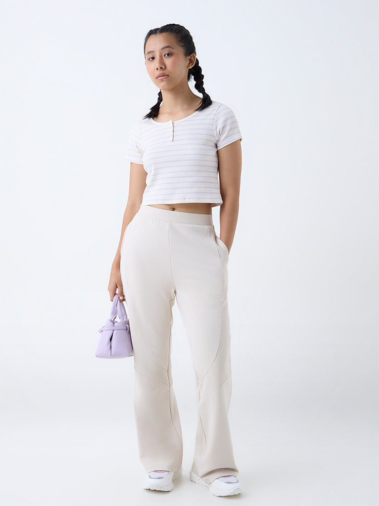 Revamp your gym rotation with this off-white tee from Studiofit, woven from a soft cotton-blend fabric with a ribbed texture that skims the body. Stripes create a sporty rhythm, while the round neck extending into a two-button placket brings a touch of refinement. With short sleeves for a versatile finish, this garment moves effortlessly from workouts to casual days.