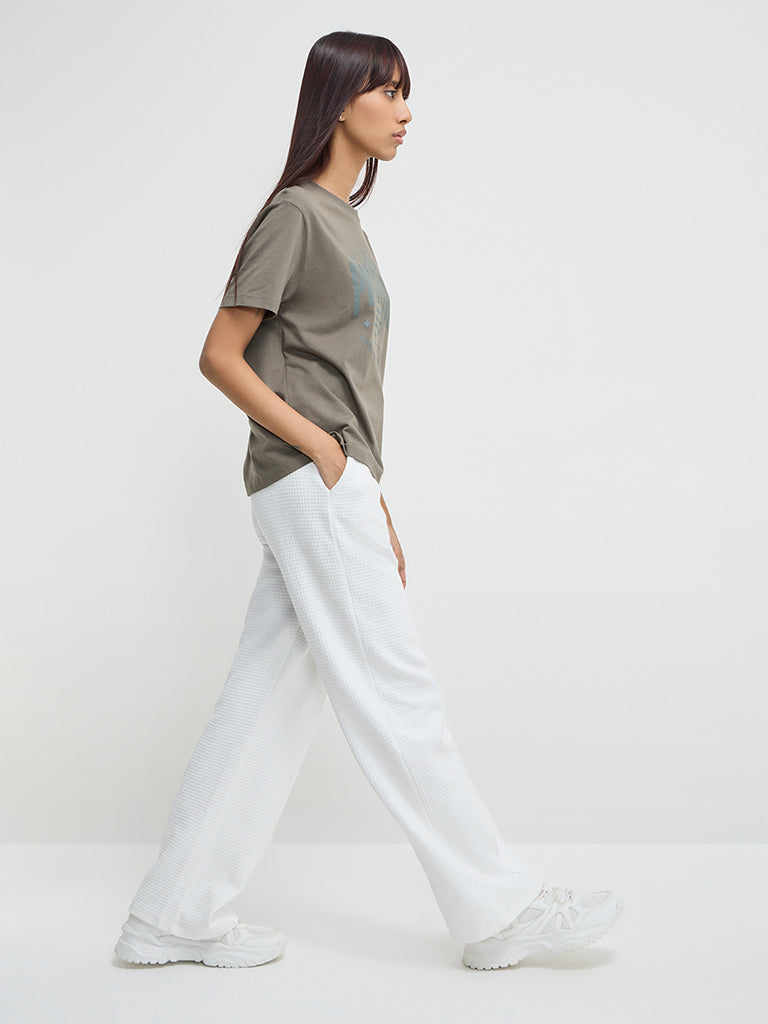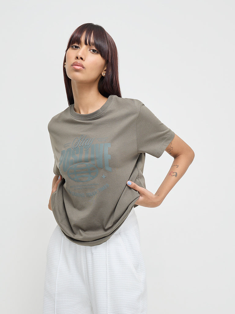 This olive t-shirt by Studiofit boasts text printed detailing. The pure cotton activewear carries a round neck and short sleeves.