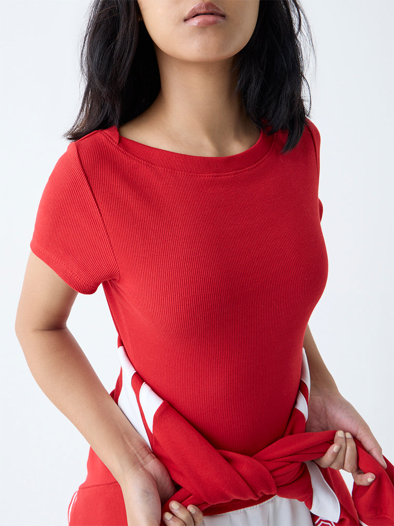 Enhance your everyday athleisure with this red t-shirt from Studiofit. Cut from a soft cotton-blend with a ribbed finish, it’s styled with a classic round neck and short sleeves for all-day ease.