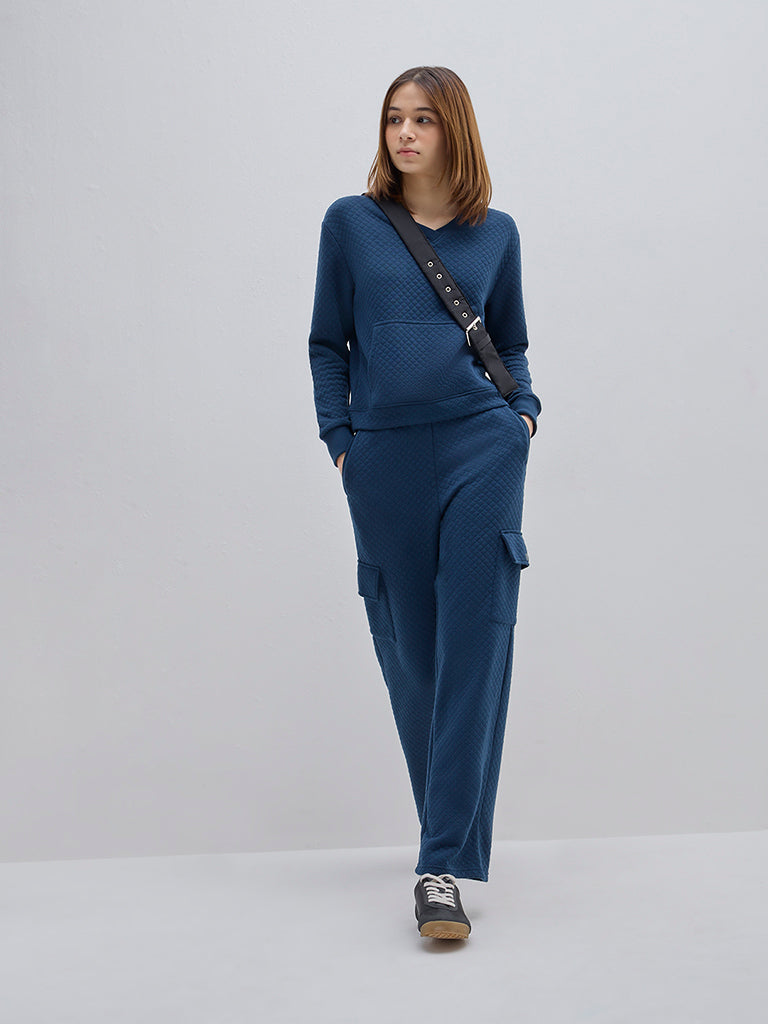 This teal Sweatshirt by Studiofit flaunts a quilted design. The garment is made with soft and breathable fabric and includes a V-neck and full sleeves. It is completed with a adorable kangaroo pockets.