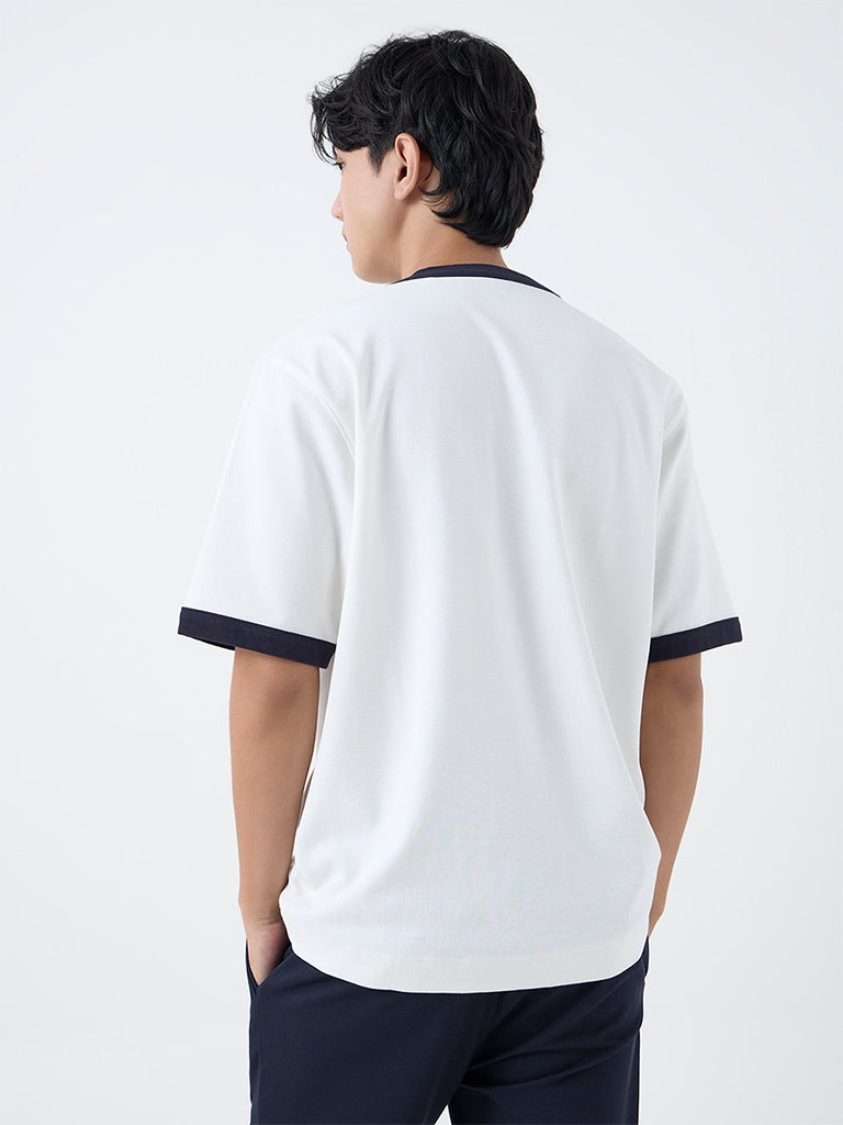 This white Studiofit t-shirt brings a sporty lift with its contrast crew neck and short sleeves. Crafted from breathable fabric, it is accented with front prints that add an athletic, dynamic edge. An easy go-to for workouts, travel or relaxed weekend wear.