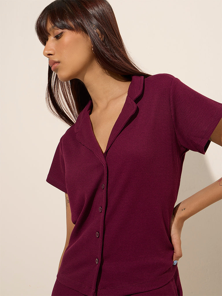 This wine shirt by Superstar is designed with waffle-textured detailing. The soft and breathable fabric loungewear includes a notched collar, button down front and short sleeves.