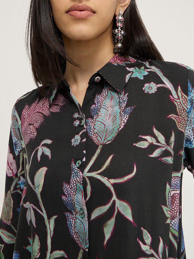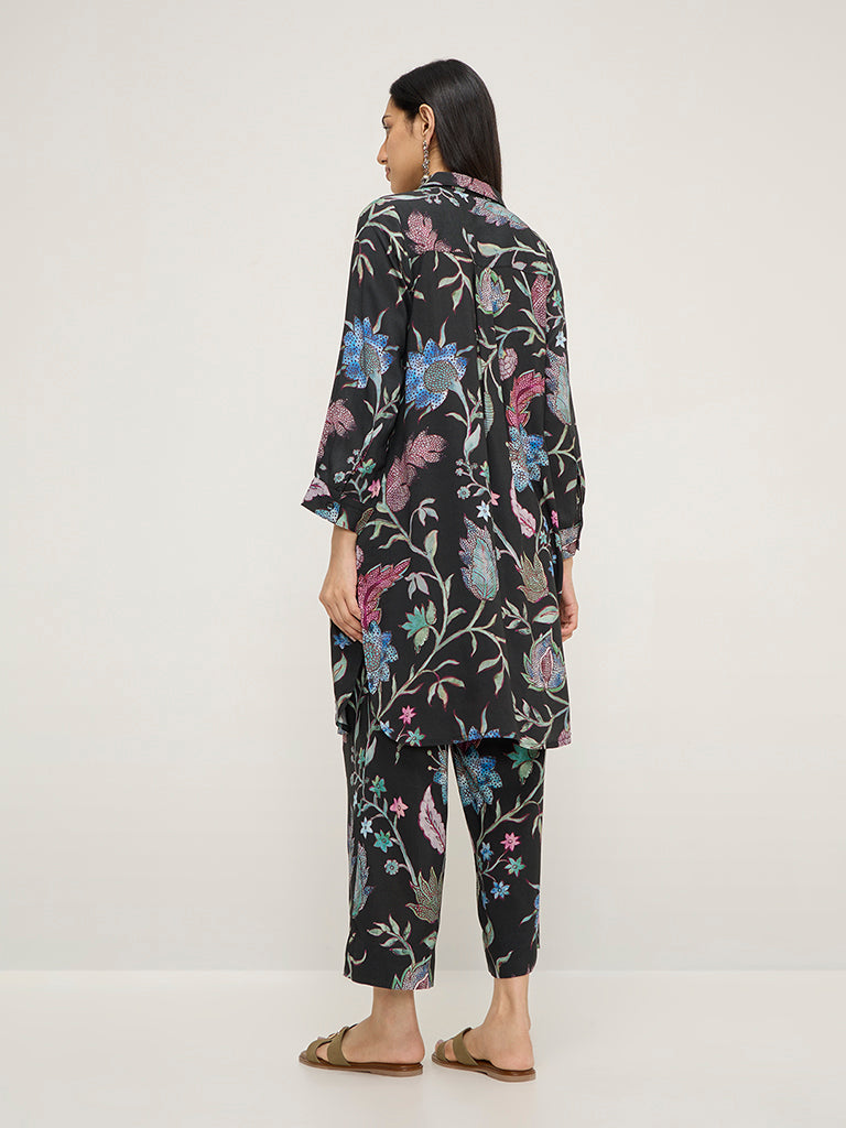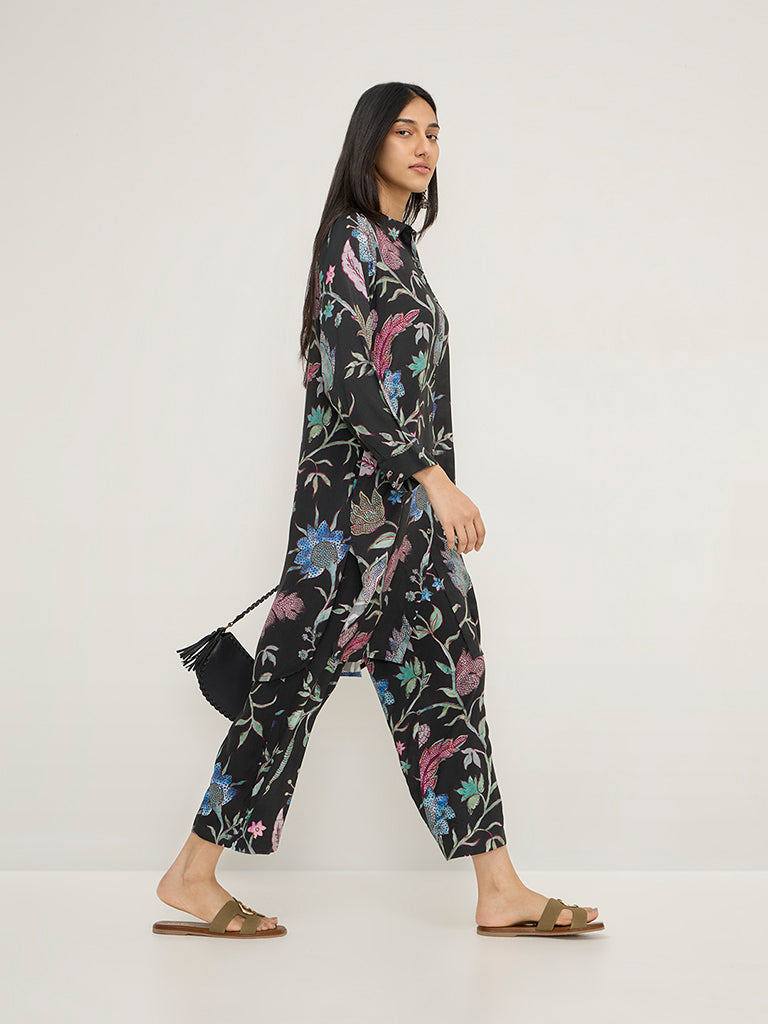 This black kurta from Utsa is adorned with botanical designs. Its breathable composition ensures easy comfort, while the semi-spread collar, button placket, and full sleeves complete it.