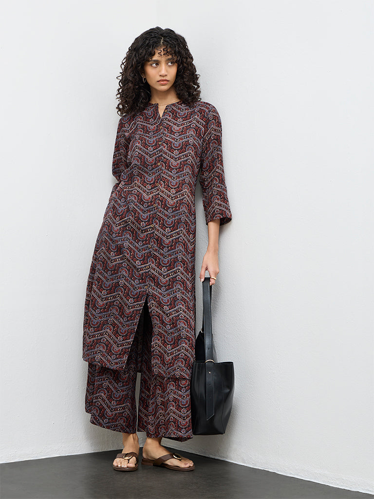 Utsa presents the black chevron printed kurta designed for a timeless ethnic appeal. Featuring a band neckline with a button-up front, it is styled with three-quarter sleeves and an A-line silhouette. A single slip-on pocket adds a touch of functionality while the versatile design pairs effortlessly with palazzos, straight pants or leggings.