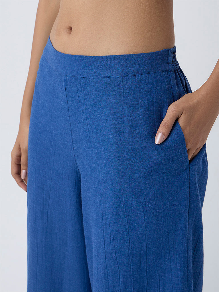 These blue palazzos from Utsa are woven from soft, lightweight fabric for all-day comfort. It is framed with an elasticated waistband and convenient pockets for a functional design. This easy silhouette offers a secure and easy fit for everyday casual rotation.