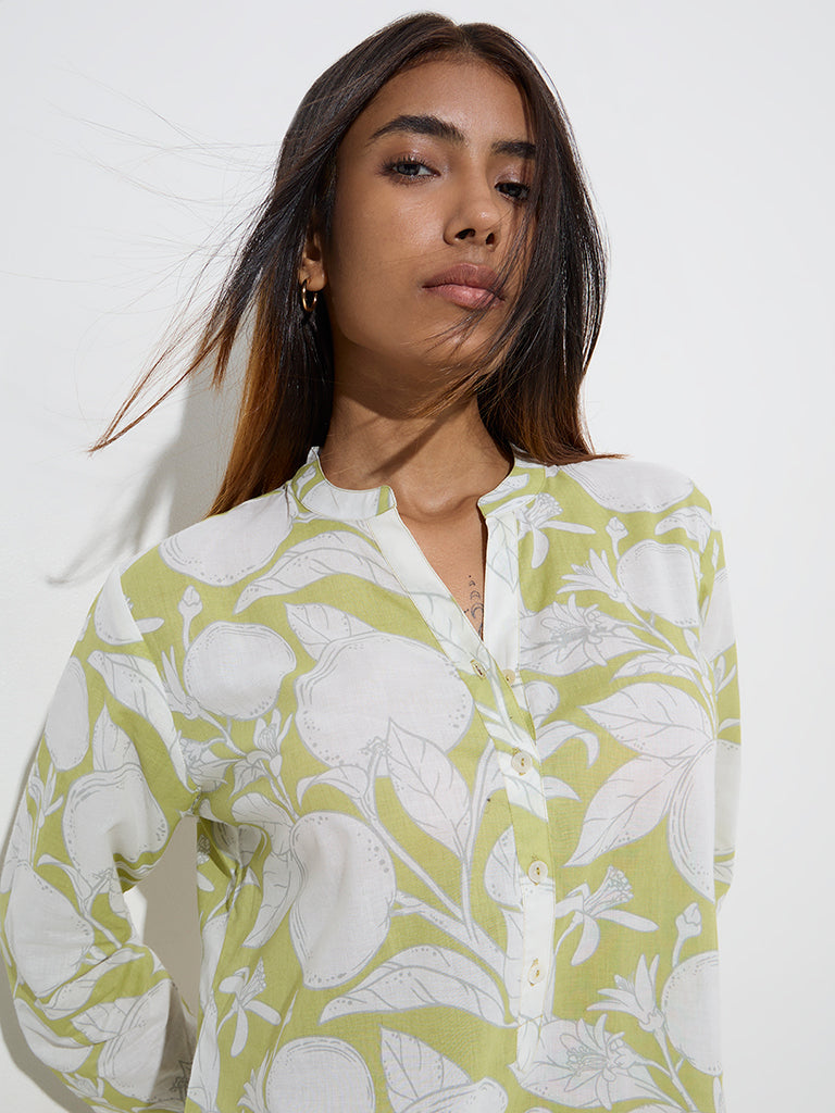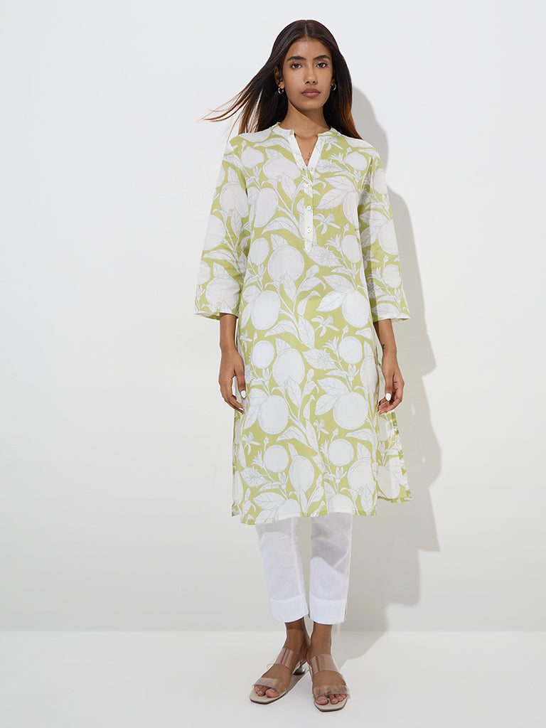 Utsa introduces this green straight kurta, enhanced with a vibrant pomegranate print for a refreshing touch. Crafted from pure cotton, it features a mandarin neckline with a four-button placket and three-quarter sleeves. The slip pocket renders practicality.
