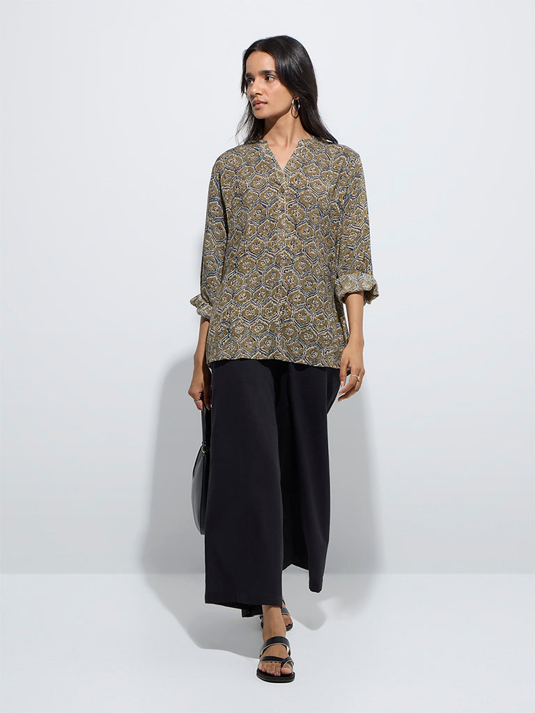 Refresh your wardrobe with this green printed tunic from Utsa. Made from quality fabric, it features a notched collar that extends into a brief button-down front, while full sleeves add a touch of elegance to the look.