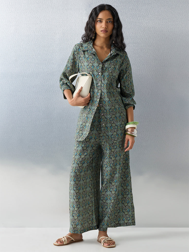 Utsa launches this green tunic featuring striking mixture of ethnic prints for a touch of refined elegance. Crafted from a breathable fabric, it ensures comfort while maintaining a polished look. Styled with a notched collar, a button placket and full sleeves, this shirt is perfect for elevating everyday outfits.