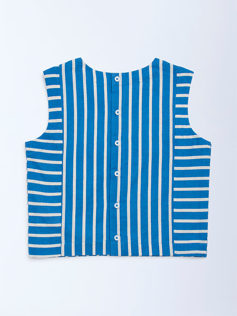 Utsa Kids introduces this blue cotton-blend top accented with delicate floral embroidery and striped detailing for a charming finish. Styled with a round neck and a sleeveless silhouette, it is a breezy choice for warm-weather dressing.