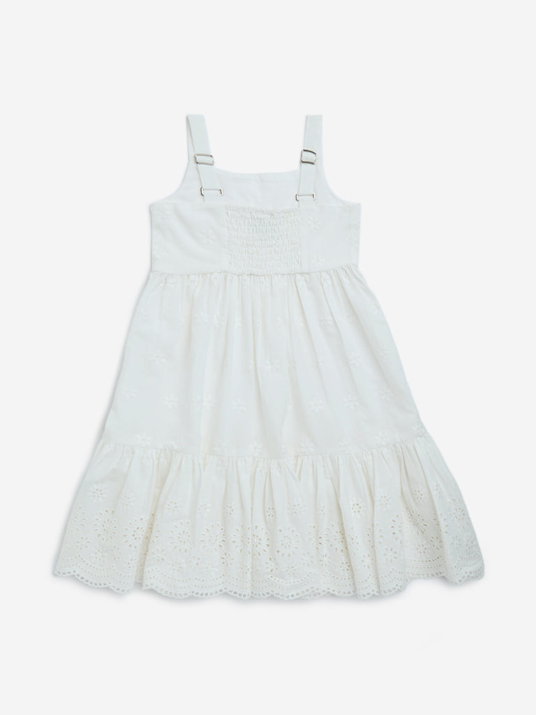 This white dress from Utsa Kids is adorned with intricate floral embroidery and schiffli accents along the hem for a charming finish. Made from a cotton-rich fabric, the tiered silhouette features a square neck, a smocked back, and adjustable straps to ensure a comfortable fit.