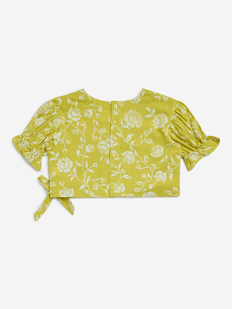 This lime top from Utsa Kids offers cheerful charm with its beautiful floral motifs. Designed with a wrap-style bodice, it features a V-neck, voluminous puff sleeves, and a bow detail at the hem. Made from a sumptuous cotton-linen blend, it offers a breathable fit that’s ideal for sunny-day outings.
