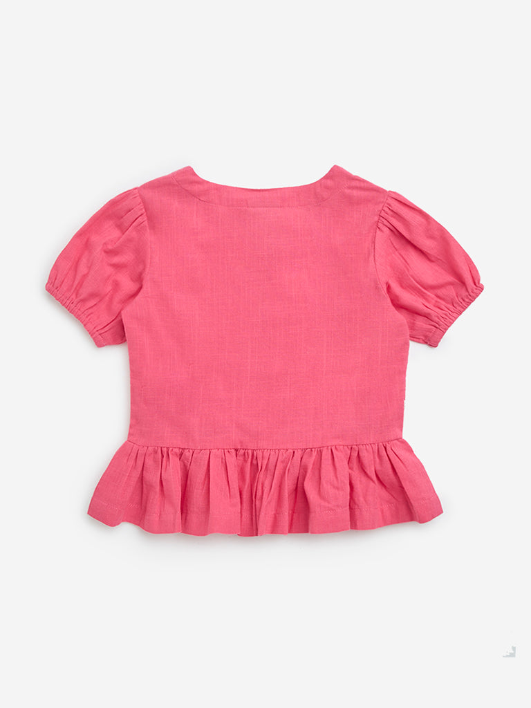 This pink ethnic top from Utsa Kids is spun from pure cotton for a luxurious feel. Adorned with delicate heart embroidery, it features a flattering V-neck and charming puff sleeves.