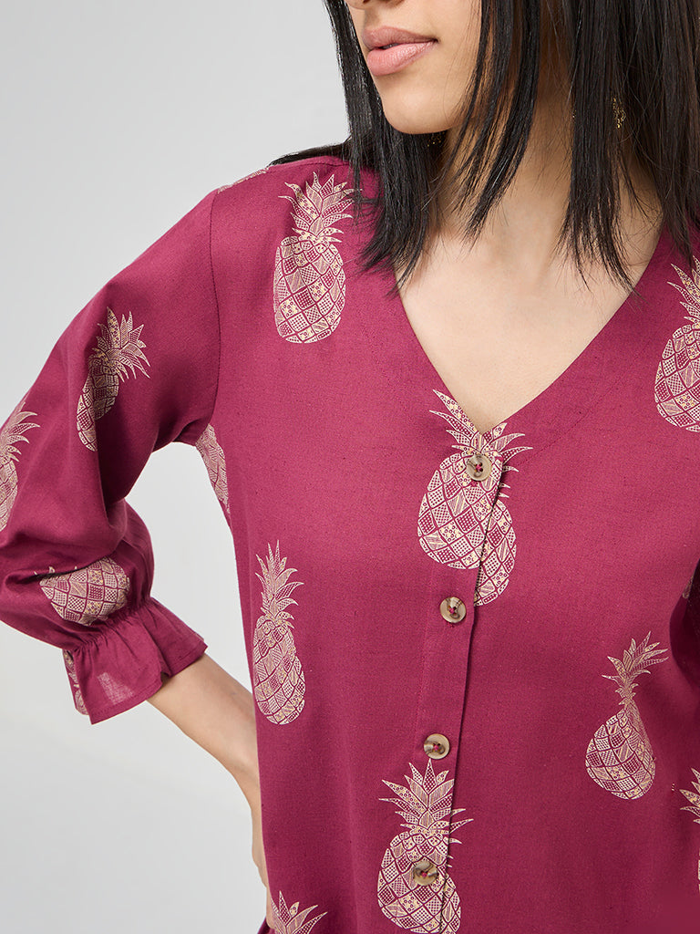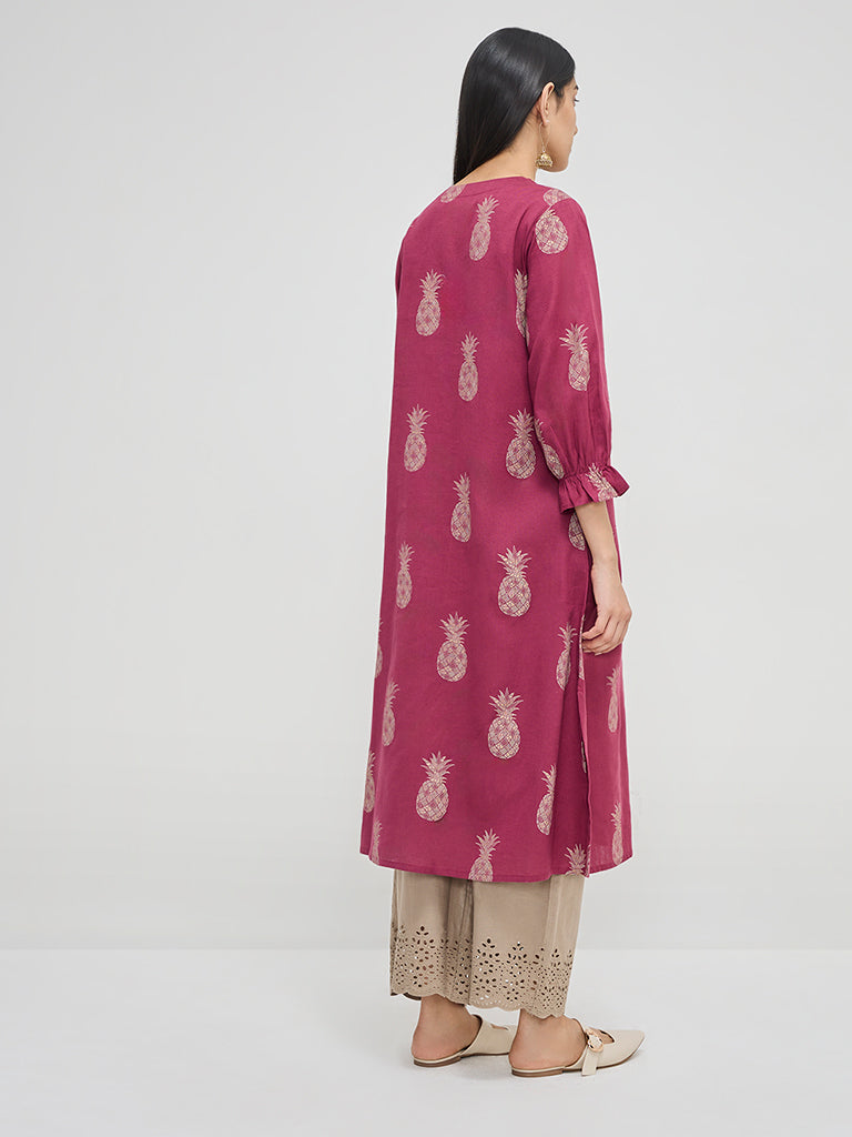 Showcasing pineapple prints, this magenta kurta from Utsa will amp up your traditional edit. It is made from a cotton-linen blend for sumptuous comfort, while the V-neck, button placket, and balloon sleeves complete it.