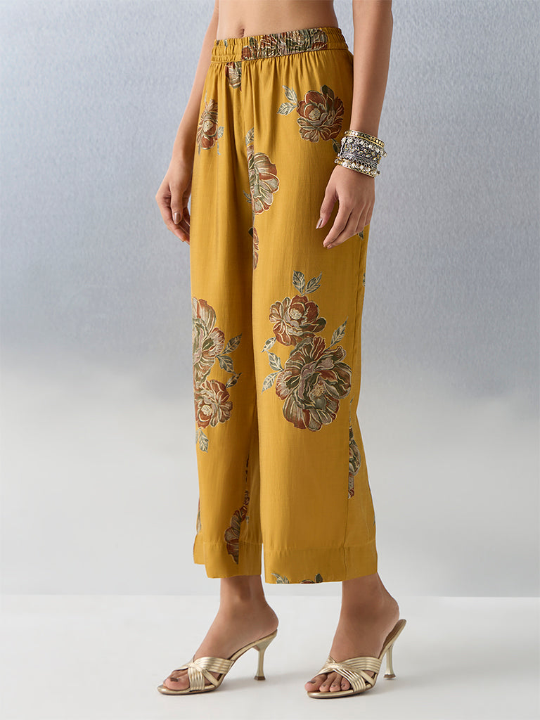 These mustard ethnic pants from Utsa exhibits large floral prints that add a statement edge to the silhouette. Milled from soft, breathable fabric, it is fitted with an elasticated waist and adjustable drawstrings for a comfortable fit. It pairs well with both ethnic tunics and contemporary tops for an effortless look.