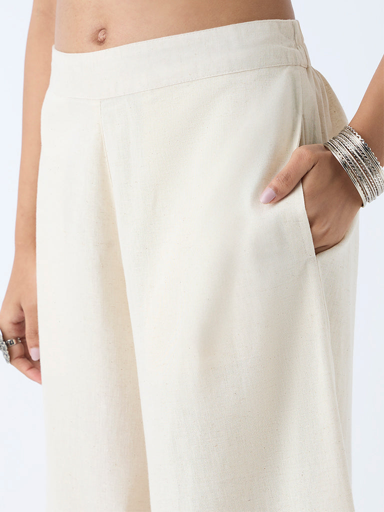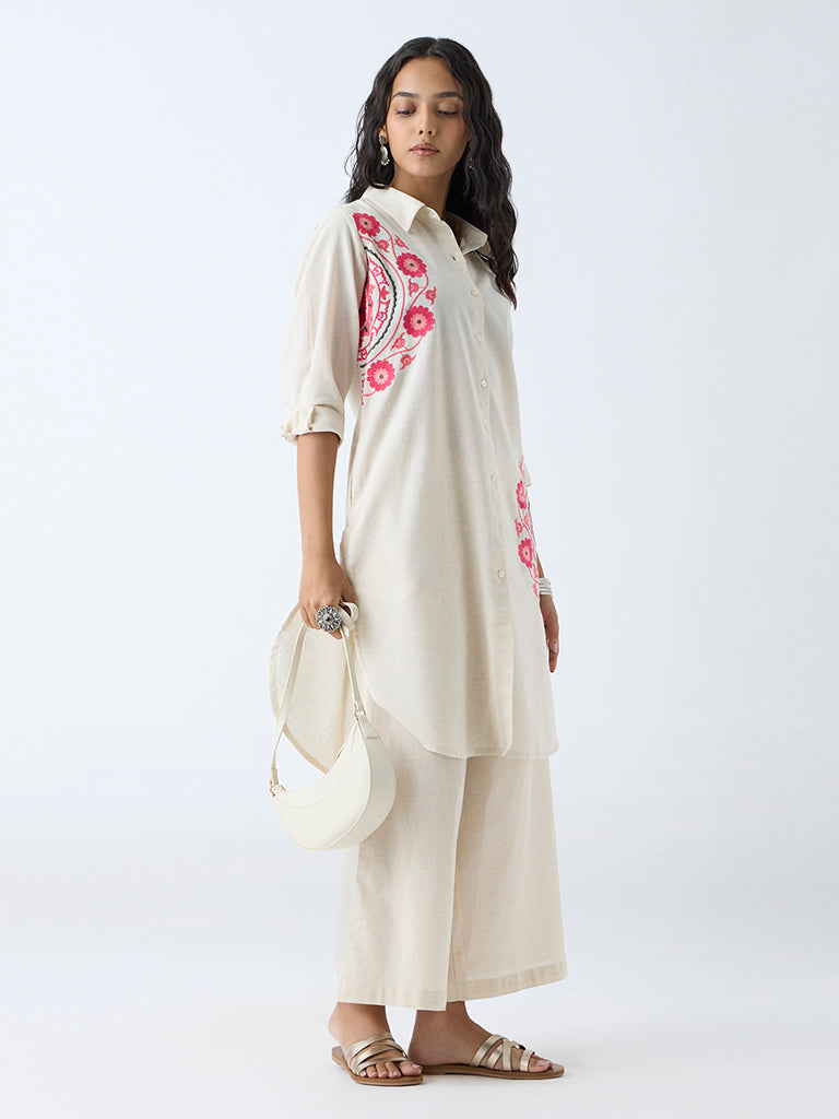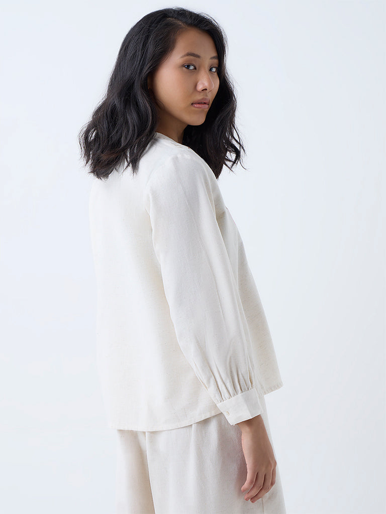 Utsa introduces this off-white ethnic top, elevated with colorful floral embroidery along the yoke that adds a pop of handcrafted charm. Spun from a rich cotton-blend fabric, it features a split neck and full sleeves, making it an easy pick for daily wear with a touch of tradition.