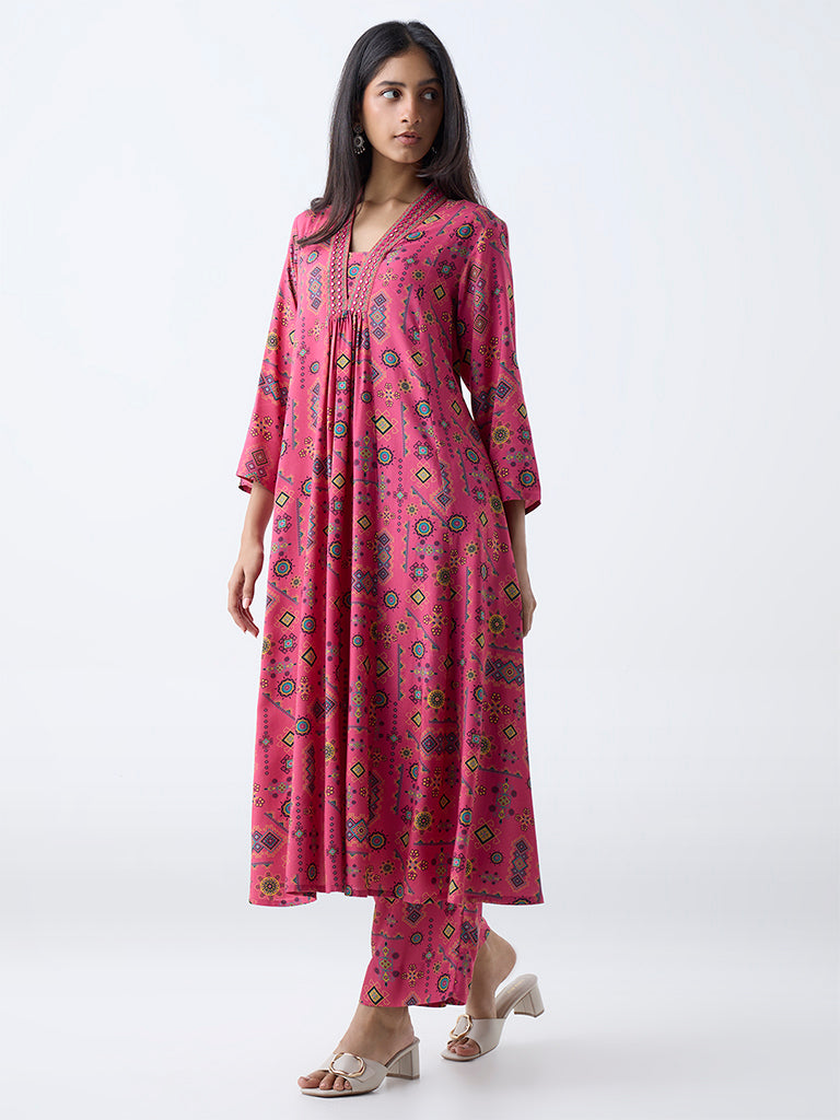 This pink kurta by Utsa is a celebration of Kutch-inspired artistry. Cut in a flowing Anarkali silhouette, it features a V-neck detailed with delicate mirror embroidery, while three-quarter sleeves and discreet side pockets blend tradition with functional elegance.