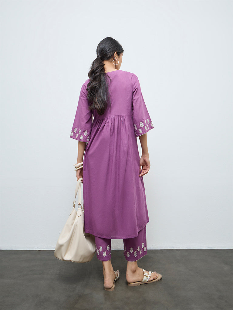 Designed with everyday elegance in mind, this purple kurta from Utsa is crafted from pure cotton fabric, delivering a sumptuous feel for all-day comfort. It is shaped in an A-line silhouette carrying a square neck and three quarter sleeves for a balanced frame. The floral embroidery placed across the yoke elevates the design, making it ideal for relaxed daytime wear or casual festive moments.
