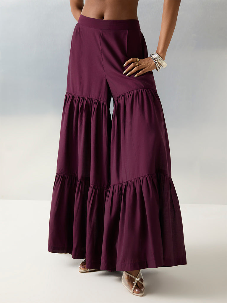 Utsa launches these purple sharara designed in tiered flares, adding volume to the silhouette. Milled from a breathable fabric, it is fitted with an elastic waist on the back for a comfortable and secure fit.