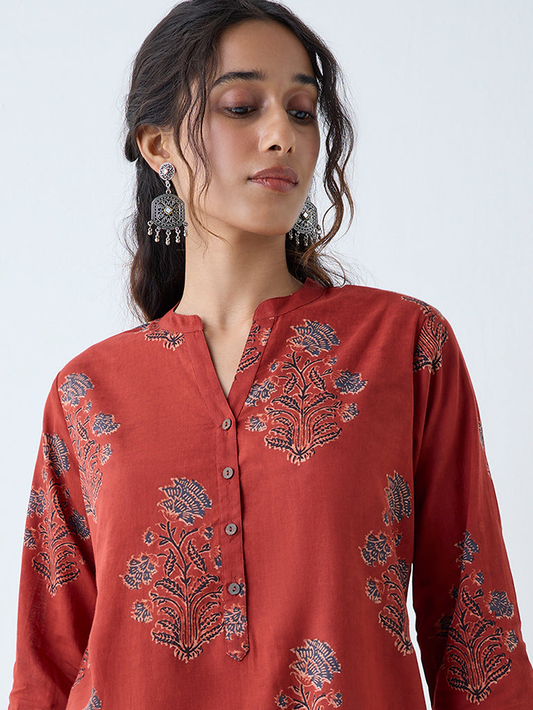 This red kurta from Utsa is decorated with intricate floral motifs that exude quiet elegance. Made from a cotton-rich fabric for breathable comfort, it’s styled with a notched neck, a short button placket, and three-quarter sleeves. The slip pocket renders practicality.