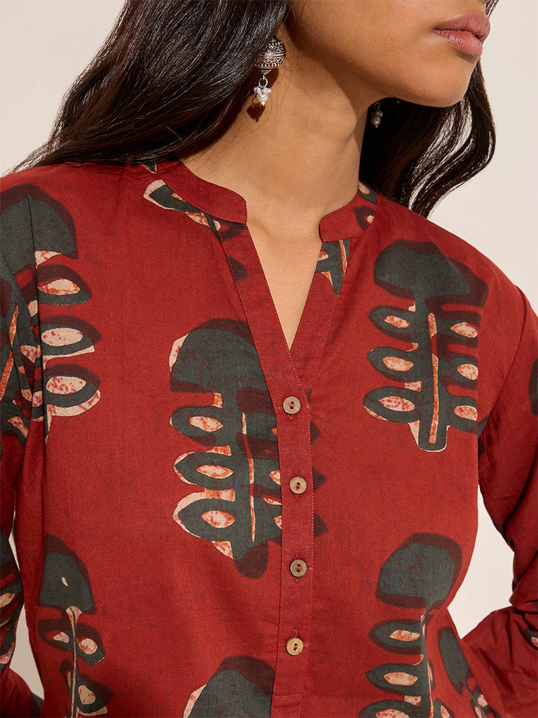 This rust kurta from Utsa flaunts mushroom prints in a straight silhouette. It is constructed from pure cotton for easy comfort and comes with a mandarin neckline extending to a button placket, three-quarter sleeves, and a slip pocket.