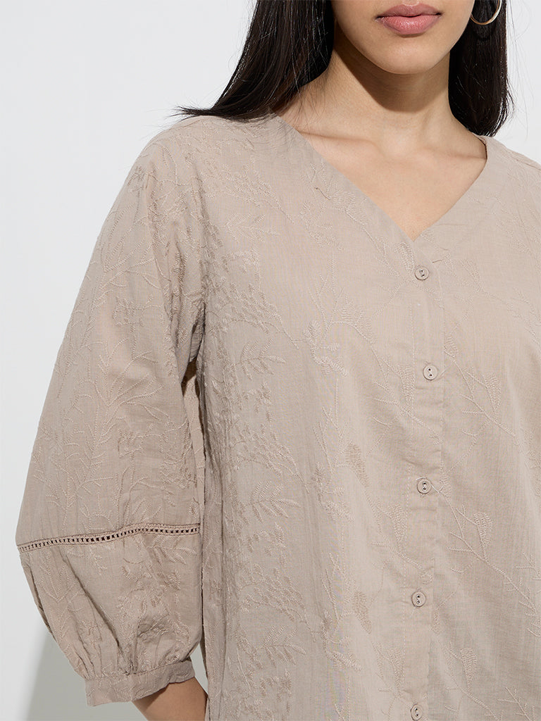 This taupe ethnic top from Utsa showcases intricate botanical embroidery for a refined touch. Woven from pure cotton, it features a flattering V-neck that extends to a button placket, while blouson sleeves add a graceful finish.