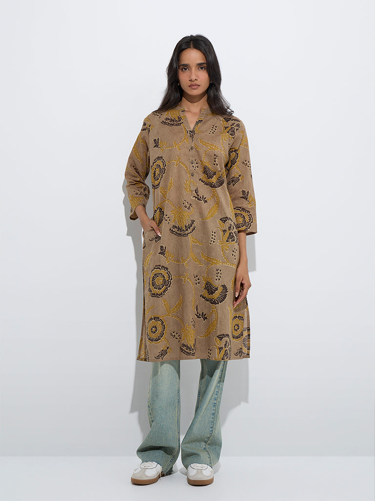 This taupe kurta from Utsa is woven from pure cotton fabric and structured in a straight frame. Featuring vibrant floral prints, it is designed with a notched neck, a brief button-up front and finished with three-quarter sleeves.