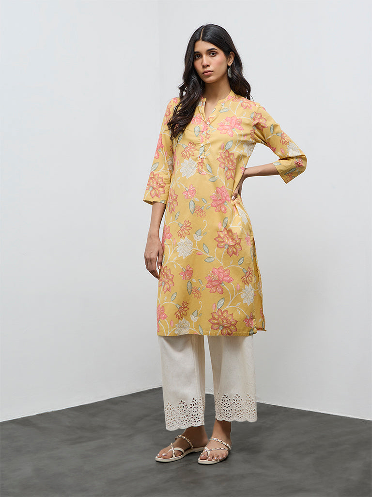 Made for everyday ethnic wear, this yellow kurta from Utsa is structured in a straight silhouette with a cotton-rich fabric base. Bold floral prints are displayed across the body for a lively appeal. Framed with a mandarin neckline, a brief buttoned placket, and three quarter sleeves, it offers comfort and ease suited for all-day wear.