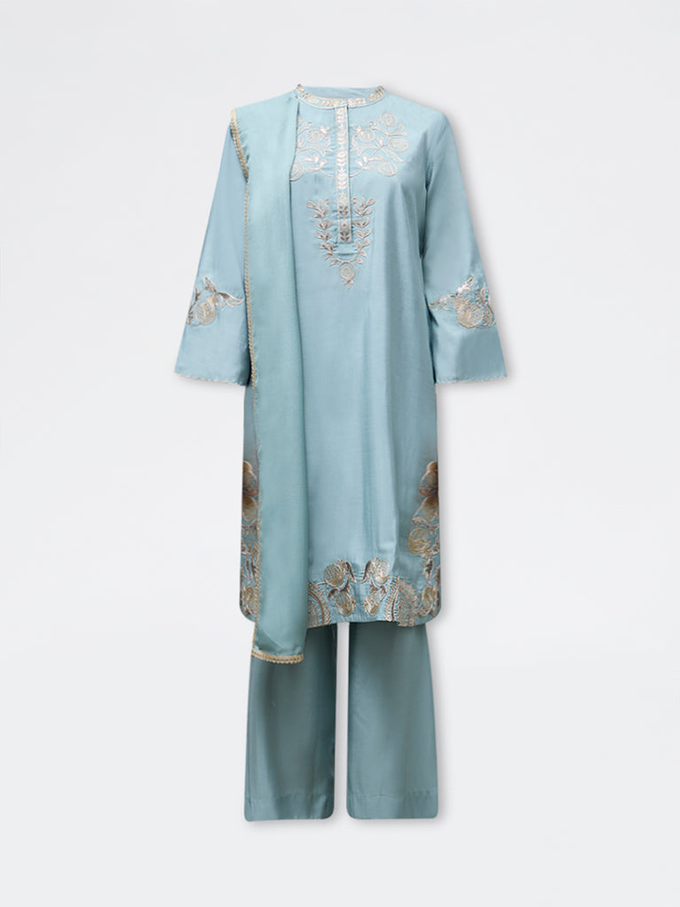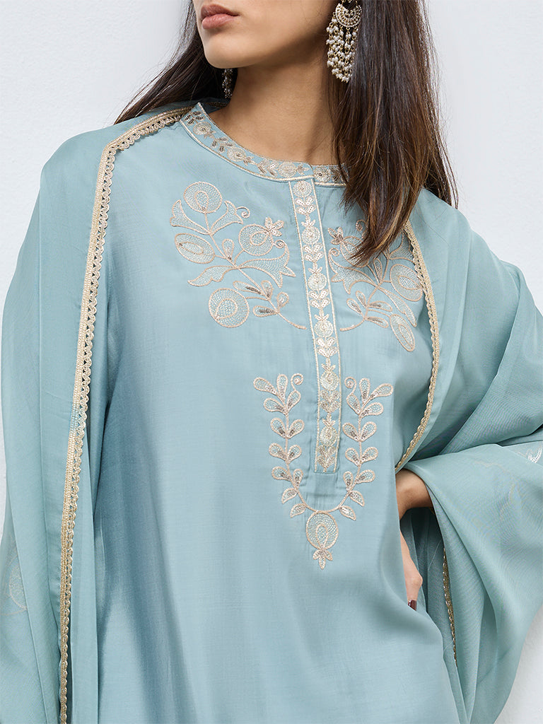 A fresh pick for festive occasions, the aqua ethnic set from Vark features a kurta shaped in an A line silhouette. Striking embroidery highlights the band neck and on the center, adding a refined focal point. The design is finished with three quarter sleeves for a balanced look. This set comes with a coordinated palazzos and a dupatta with an embroidered hem and fringed edges to complete the ensemble. Crafted from a breathable fabric, this set is well suited for celebrations and special gatherings.