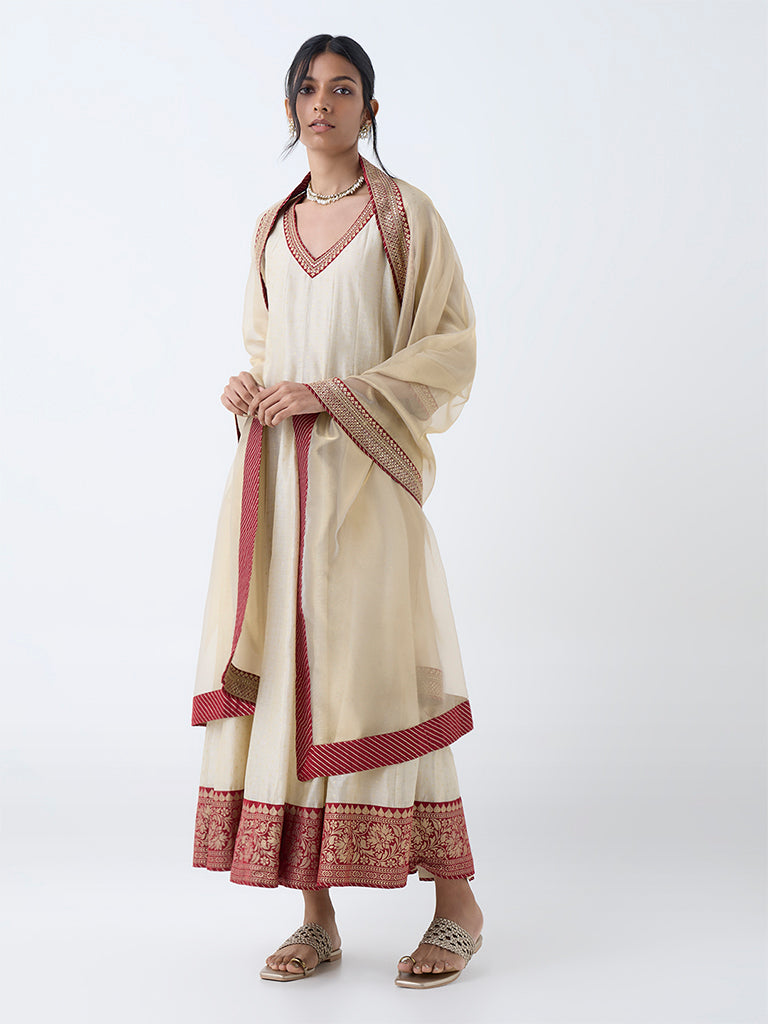 Vark introduces an aura of understated glamour in your ethnic contingent with this beige set. The Anarkali kurta is beautifully adorned with sequin work and intricate embroidery, while the flattering V-neck and three-quarter sleeves offer elegance to the silhouette. Crafted from a breathable fabric for lasting comfort, the ensemble is completed with a sheer dupatta for a regal finish.