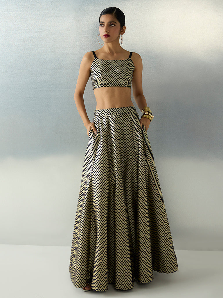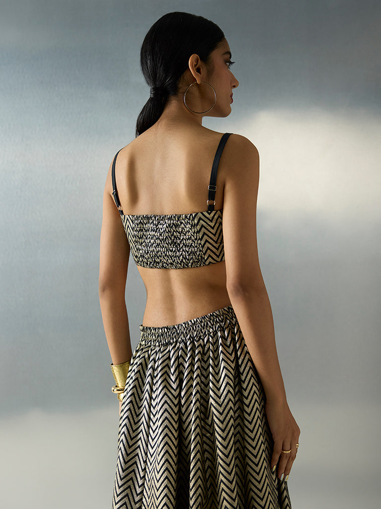 This black ethnic blouse by Vark offers a refined celebratory statement that balances traditional motifs with contemporary ease. Milled from a sumptuous fabric with chevron motifs, it transitions seamlessly from day celebrations to evening gatherings. The square neck, adjustable straps, and smocked back ensure a comfortable fit while allowing ease of movement.