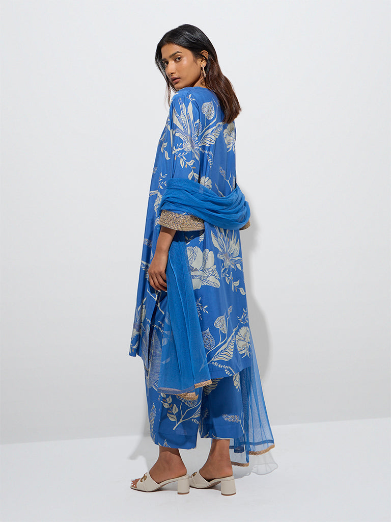 Spun from a breathable fabric for effortless comfort, this blue kurta set from Vark combines sophistication with relaxed charm. The kurta is decked with botanical patterns and is finished with a V-neck and flared sleeves, enhanced with delicate zari embroidery for a graceful appeal. It’s paired with flowy palazzos fitted with an elasticated waistband, while a net dupatta completes the look with a soft, festive finish.