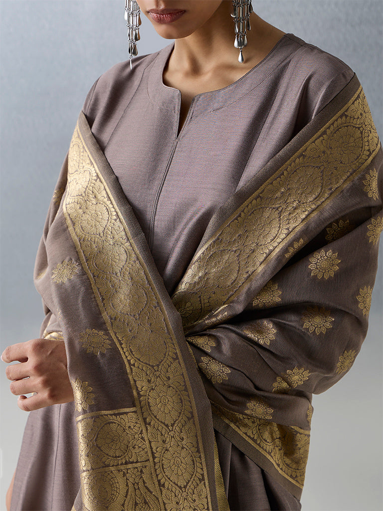 Radiate festive charm in this brown ethnic set from Vark, featuring an Anarkali kurta, designed with a split neck and three-quarters sleeves. Complemented by elasticated palazzos for ease of movement, the lightweight fabric ensemble is finished with a soft dupatta adorned with gold-toned embroidery, adding an elegant finish to the look.