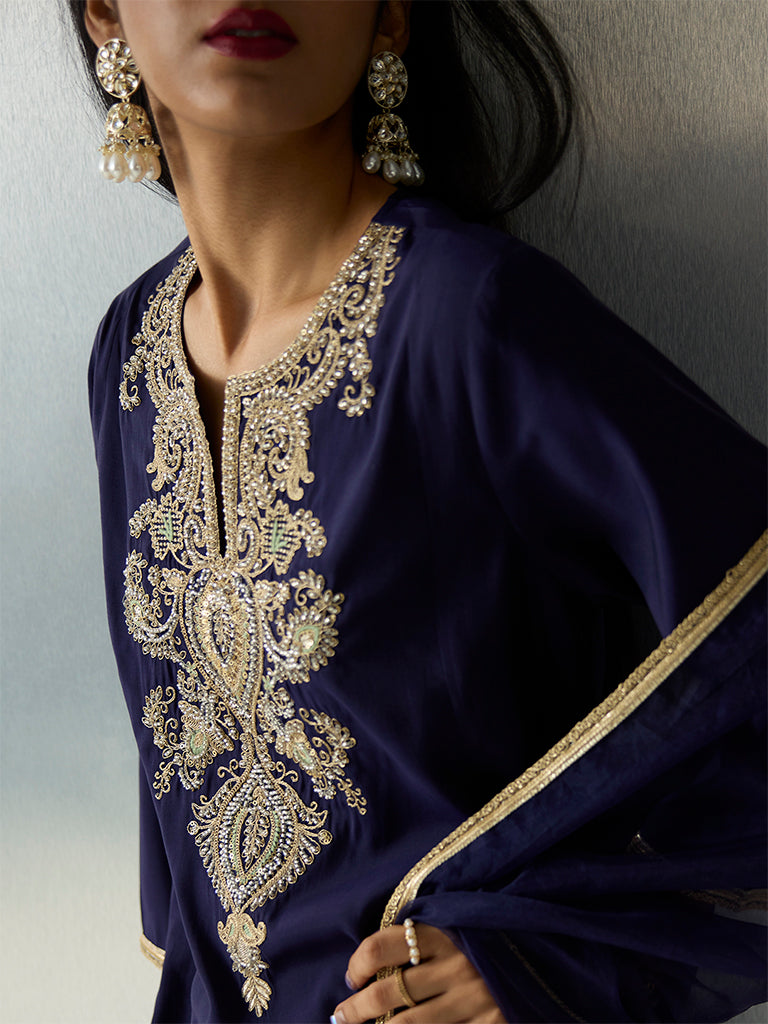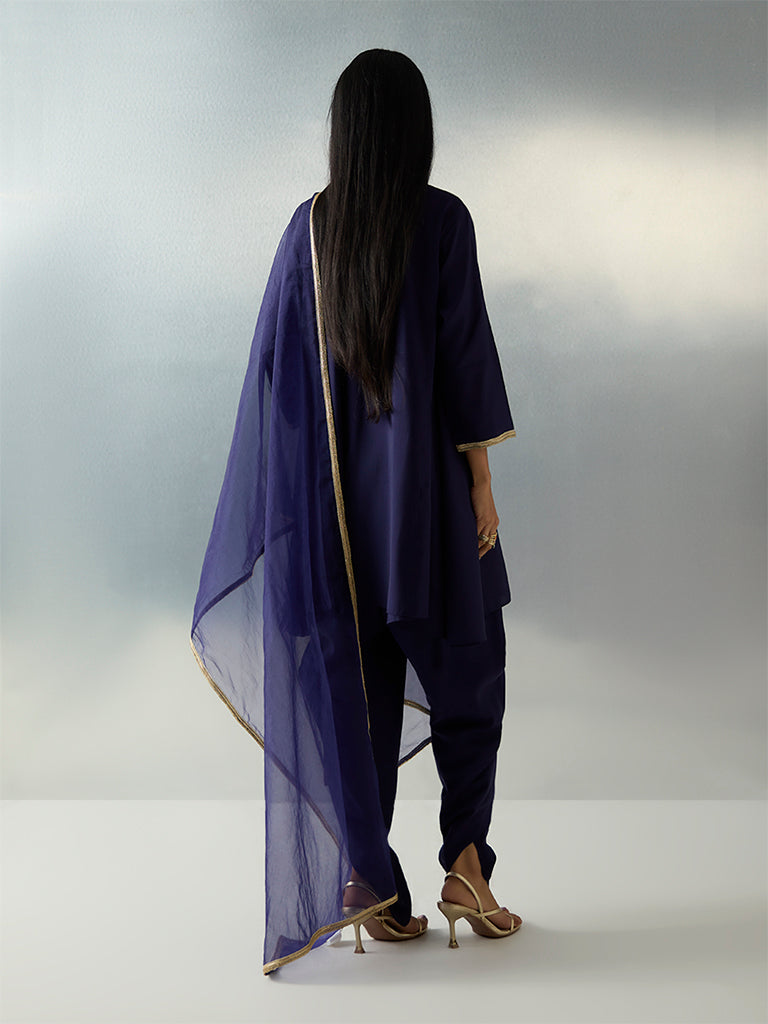 Perfect for evenings filled with light and laughter, this navy ethnic set by Vark blends comfort with festive sparkle. A sequin-detailed kurta pairs with draped dhoti pants, while the embroidered dupatta adds a graceful finishing layer, making it a polished choice for any celebration.