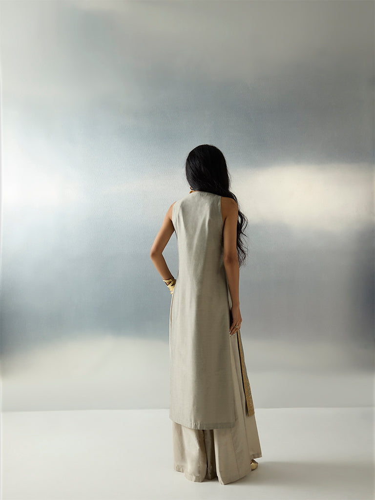 This silver three-piece set from Vark is made for modern festive wardrobes. The embroidered sleeveless kurta with a plunging neckline layers over a solid inner top for balance, while wide palazzos with a smooth waistband and pockets add ease. A chic option for contemporary occasions.