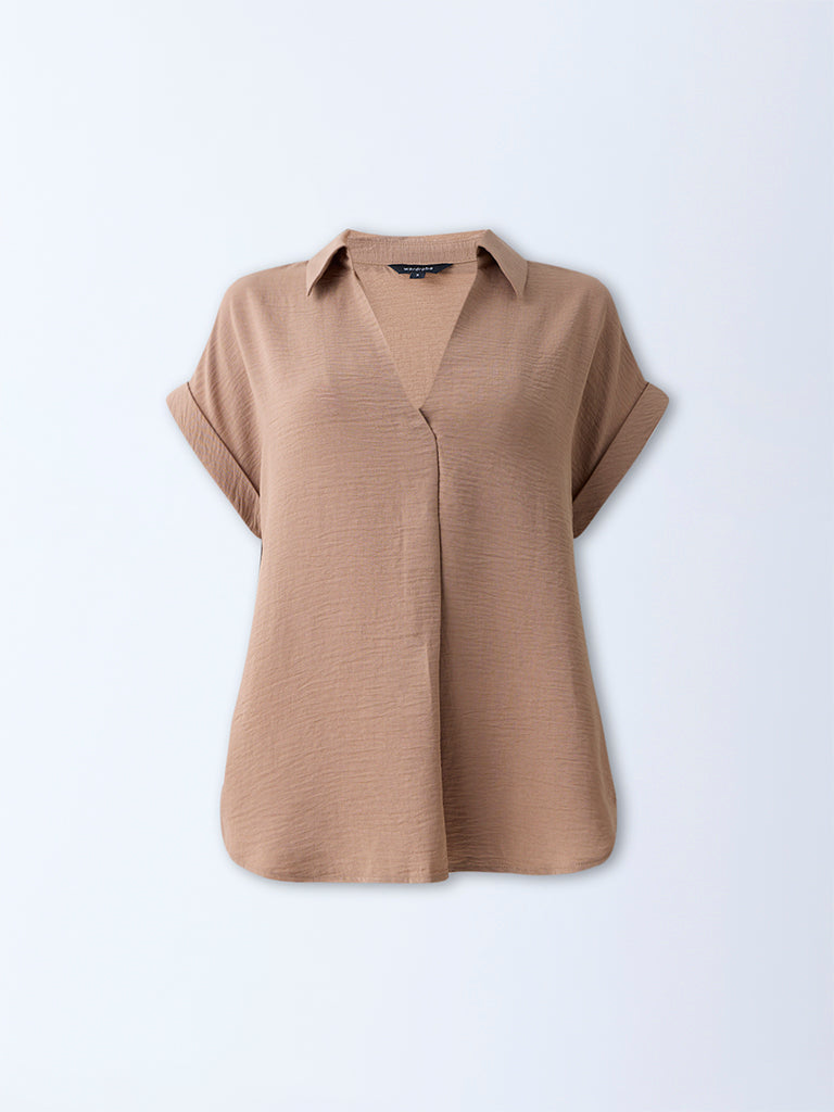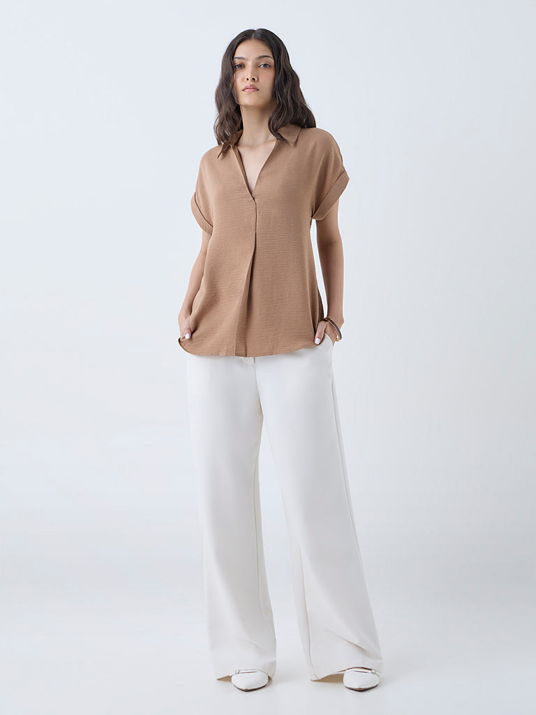 Tailored from a crinkle-textured fabric for sumptuous comfort, this beige top from Wardrobe balances structure with softness. Featuring a defined V-neck collar and upturned dolman sleeves, it’s ideal for layering under sharp tailoring or wearing solo with pared-back separates.